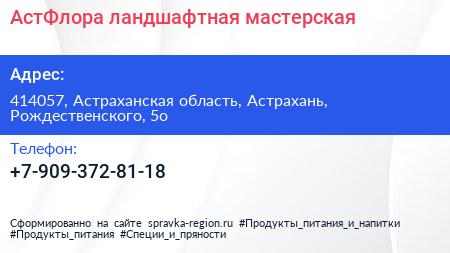 АстФлора, ландшафтная мастерская по адресу 414057, Астраханская область, Астрахань, Рождественского, 5о в дальнейшем Организация, размещена в следующих категориях:
