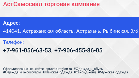 АстСамосвал, торговая компания по адресу 414041, Астраханская область, Астрахань, Рыбинская, 3/6 в дальнейшем Организация, размещена в следующих категориях: