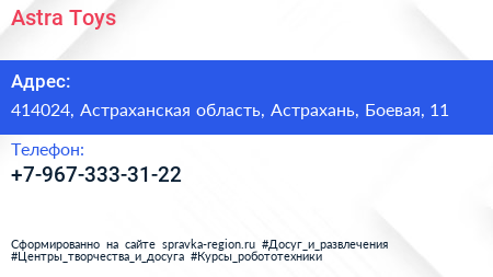 Astra Toys по адресу 414024, Астраханская область, Астрахань, Боевая, 11 в дальнейшем Организация, размещена в следующих категориях: