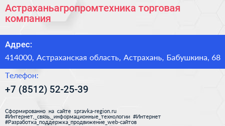Астраханьагропромтехника, торговая компания по адресу 414000, Астраханская область, Астрахань, Бабушкина, 68 в дальнейшем Организация, размещена в следующих категориях: