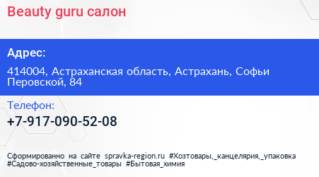 Beauty-guru, салон по адресу 414004, Астраханская область, Астрахань, Софьи Перовской, 84 в дальнейшем Организация, размещена в следующих категориях: