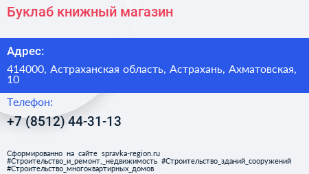 Буклаб, книжный магазин по адресу 414000, Астраханская область, Астрахань, Ахматовская, 10 в дальнейшем Организация, размещена в следующих категориях: