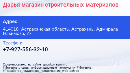 Дарья, магазин строительных материалов по адресу 414018, Астраханская область, Астрахань, Адмирала Нахимова, 77 в дальнейшем Организация, размещена в следующих категориях: