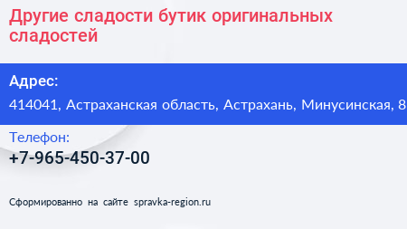 Другие сладости, бутик оригинальных сладостей по адресу 414041, Астраханская область, Астрахань, Минусинская, 8 в дальнейшем Организация, размещена в следующих категориях: