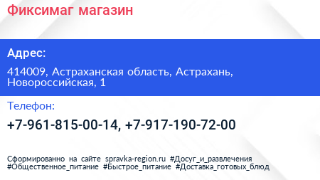 Фиксимаг, магазин по адресу 414009, Астраханская область, Астрахань, Новороссийская, 1 в дальнейшем Организация, размещена в следующих категориях:
