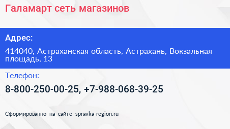 Галамарт, сеть магазинов по адресу 414040, Астраханская область, Астрахань, Вокзальная площадь, 13 в дальнейшем Организация, размещена в следующих категориях: