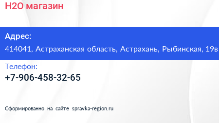 H2O, магазин по адресу 414041, Астраханская область, Астрахань, Рыбинская, 19в в дальнейшем Организация, размещена в следующих категориях: