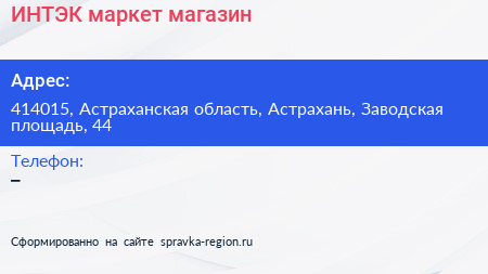 ИНТЭК-маркет, магазин по адресу 414015, Астраханская область, Астрахань, Заводская площадь, 44 в дальнейшем Организация, размещена в следующих категориях: