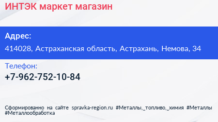 ИНТЭК-маркет, магазин по адресу 414028, Астраханская область, Астрахань, Немова, 34 в дальнейшем Организация, размещена в следующих категориях: