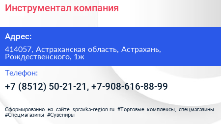 Инструментал, компания по адресу 414057, Астраханская область, Астрахань, Рождественского, 1ж в дальнейшем Организация, размещена в следующих категориях: