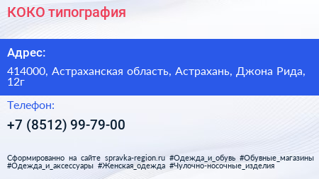 КОКО, типография по адресу 414000, Астраханская область, Астрахань, Джона Рида, 12г в дальнейшем Организация, размещена в следующих категориях: