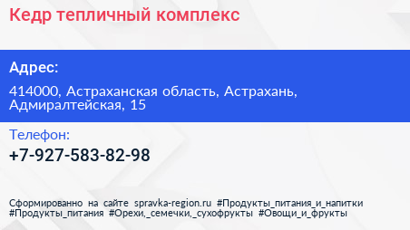 Кедр, тепличный комплекс по адресу 414000, Астраханская область, Астрахань, Адмиралтейская, 15 в дальнейшем Организация, размещена в следующих категориях: