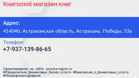 Книголюб, магазин книг по адресу 414040, Астраханская область, Астрахань, Победы, 53а в дальнейшем Организация, размещена в следующих категориях:
