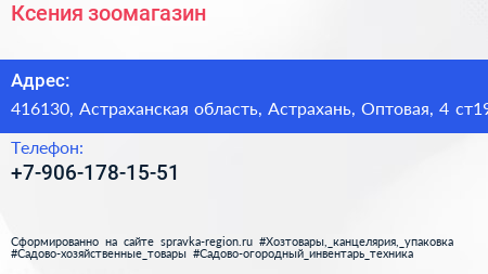 Ксения, зоомагазин по адресу 416130, Астраханская область, Астрахань, Оптовая, 4 ст19 в дальнейшем Организация, размещена в следующих категориях: