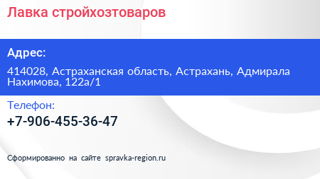 Лавка стройхозтоваров по адресу 414028, Астраханская область, Астрахань, Адмирала Нахимова, 122а/1 в дальнейшем Организация, размещена в следующих категориях: