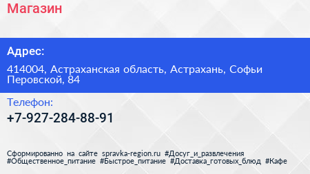 Магазин по адресу 414004, Астраханская область, Астрахань, Софьи Перовской, 84 в дальнейшем Организация, размещена в следующих категориях: