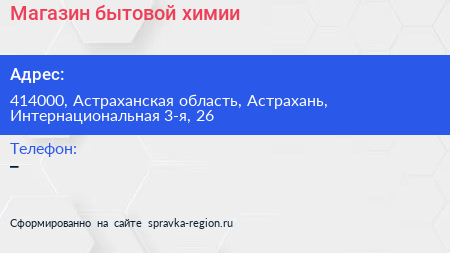 Магазин бытовой химии по адресу 414000, Астраханская область, Астрахань, Интернациональная 3-я, 26 в дальнейшем Организация, размещена в следующих категориях:
