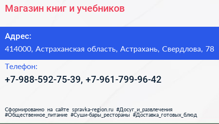 Магазин книг и учебников по адресу 414000, Астраханская область, Астрахань, Свердлова, 78 в дальнейшем Организация, размещена в следующих категориях: