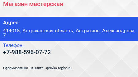 Магазин-мастерская по адресу 414018, Астраханская область, Астрахань, Александрова, 7 в дальнейшем Организация, размещена в следующих категориях: