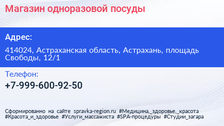 Магазин одноразовой посуды по адресу 414024, Астраханская область, Астрахань, площадь Свободы, 12/1 в дальнейшем Организация, размещена в следующих категориях: