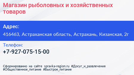 Магазин рыболовных и хозяйственных товаров по адресу 416463, Астраханская область, Астрахань, Кизанская, 2г в дальнейшем Организация, размещена в следующих категориях: