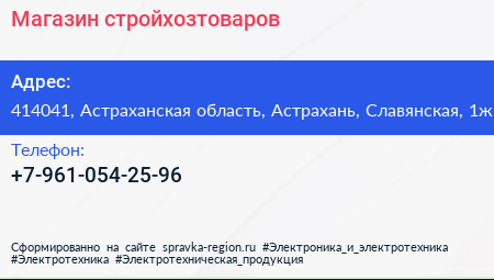 Магазин стройхозтоваров по адресу 414041, Астраханская область, Астрахань, Славянская, 1ж в дальнейшем Организация, размещена в следующих категориях: