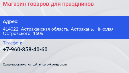 Магазин товаров для праздников по адресу 414022, Астраханская область, Астрахань, Николая Островского, 160в в дальнейшем Организация, размещена в следующих категориях: