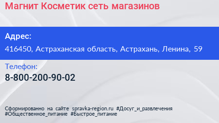 Магнит Косметик, сеть магазинов по адресу 416450, Астраханская область, Астрахань, Ленина, 59 в дальнейшем Организация, размещена в следующих категориях: