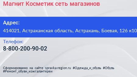 Магнит Косметик, сеть магазинов по адресу 414021, Астраханская область, Астрахань, Боевая, 126 к10 в дальнейшем Организация, размещена в следующих категориях: