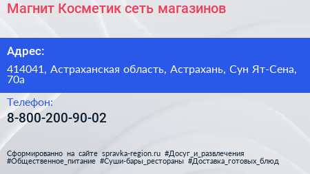 Магнит Косметик, сеть магазинов по адресу 414041, Астраханская область, Астрахань, Сун Ят-Сена, 70а в дальнейшем Организация, размещена в следующих категориях: