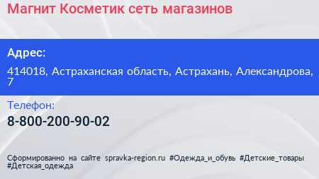 Магнит Косметик, сеть магазинов по адресу 414018, Астраханская область, Астрахань, Александрова, 7 в дальнейшем Организация, размещена в следующих категориях: