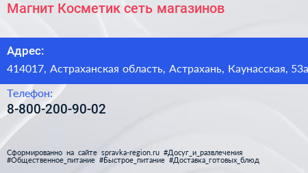 Магнит Косметик, сеть магазинов по адресу 414017, Астраханская область, Астрахань, Каунасская, 53а в дальнейшем Организация, размещена в следующих категориях: