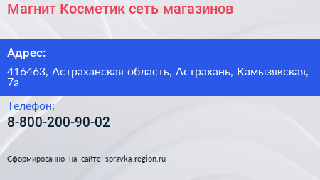 Магнит Косметик, сеть магазинов по адресу 416463, Астраханская область, Астрахань, Камызякская, 7а в дальнейшем Организация, размещена в следующих категориях: