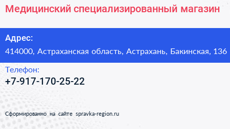 Медицинский специализированный магазин по адресу 414000, Астраханская область, Астрахань, Бакинская, 136 в дальнейшем Организация, размещена в следующих категориях: