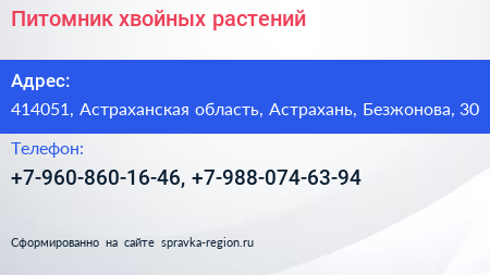 Питомник хвойных растений по адресу 414051, Астраханская область, Астрахань, Безжонова, 30 в дальнейшем Организация, размещена в следующих категориях:
