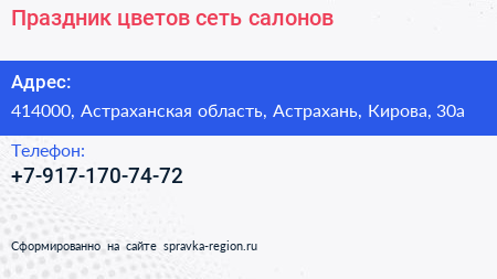 Праздник цветов, сеть салонов по адресу 414000, Астраханская область, Астрахань, Кирова, 30а в дальнейшем Организация, размещена в следующих категориях: