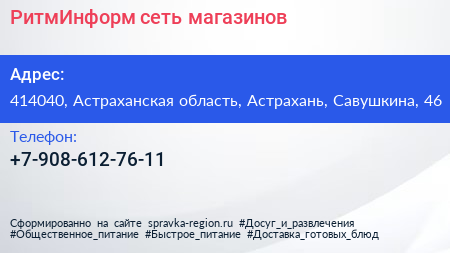 РитмИнформ, сеть магазинов по адресу 414040, Астраханская область, Астрахань, Савушкина, 46 в дальнейшем Организация, размещена в следующих категориях: