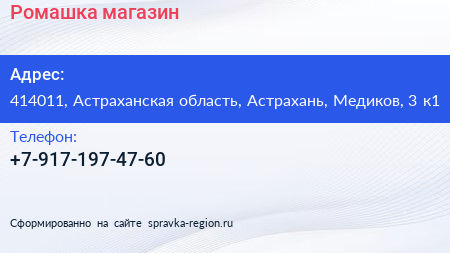 Ромашка, магазин по адресу 414011, Астраханская область, Астрахань, Медиков, 3 к1 в дальнейшем Организация, размещена в следующих категориях: