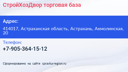 СтройХозДвор, торговая база по адресу 414017, Астраханская область, Астрахань, Акмолинская, 20 в дальнейшем Организация, размещена в следующих категориях: