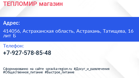 ТЕПЛОМИР, магазин по адресу 414056, Астраханская область, Астрахань, Татищева, 16 лит Б в дальнейшем Организация, размещена в следующих категориях: