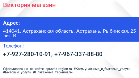 Виктория, магазин по адресу 414041, Астраханская область, Астрахань, Рыбинская, 25 лит В в дальнейшем Организация, размещена в следующих категориях: