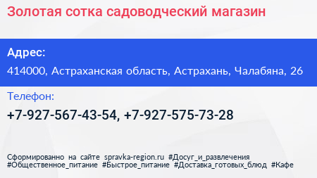 Золотая сотка, садоводческий магазин по адресу 414000, Астраханская область, Астрахань, Чалабяна, 26 в дальнейшем Организация, размещена в следующих категориях:
