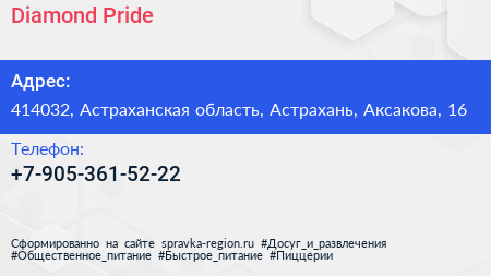 Diamond Pride по адресу 414032, Астраханская область, Астрахань, Аксакова, 16 в дальнейшем Организация, размещена в следующих категориях: