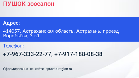 ПУШОК, зоосалон по адресу 414057, Астраханская область, Астрахань, проезд Воробьёва, 3 к1 в дальнейшем Организация, размещена в следующих категориях: