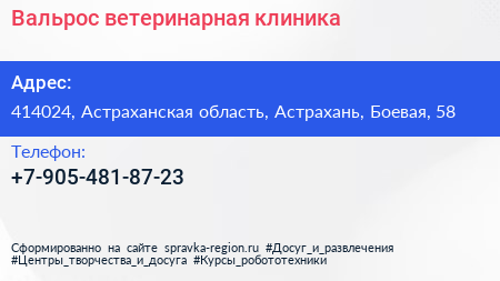 Вальрос, ветеринарная клиника по адресу 414024, Астраханская область, Астрахань, Боевая, 58 в дальнейшем Организация, размещена в следующих категориях: