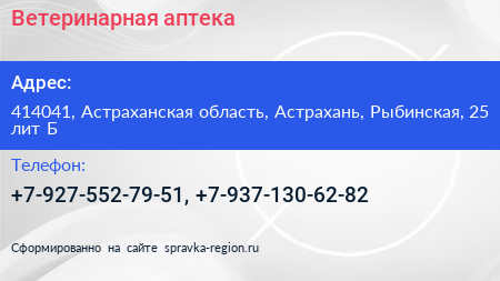 Ветеринарная аптека по адресу 414041, Астраханская область, Астрахань, Рыбинская, 25 лит Б в дальнейшем Организация, размещена в следующих категориях: