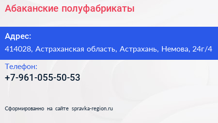 Абаканские полуфабрикаты по адресу 414028, Астраханская область, Астрахань, Немова, 24г/4 в дальнейшем Организация, размещена в следующих категориях: