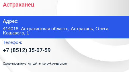 Астраханец по адресу 414018, Астраханская область, Астрахань, Олега Кошевого, 1 в дальнейшем Организация, размещена в следующих категориях: