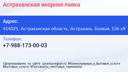 Астраханская икорная лавка по адресу 414021, Астраханская область, Астрахань, Боевая, 126 к9 в дальнейшем Организация, размещена в следующих категориях:
