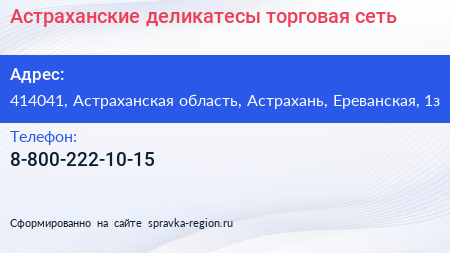 Астраханские деликатесы, торговая сеть по адресу 414041, Астраханская область, Астрахань, Ереванская, 1з в дальнейшем Организация, размещена в следующих категориях: